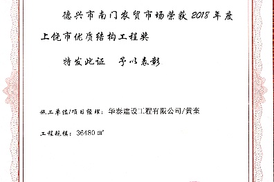 日前,由華泰建設工程有限公司承建的上饒德興南門農貿市場項目,榮獲了上饒市住房和城鄉建設局頒發的“2018年度上饒市優質結構工程獎”。 為把該項工程打造成省優工程,華泰建設工程有限公司秉承“質量為先,信譽為重,管理為本,服務為誠”的企業理念,遵循“建設一項工程,樹立一座豐碑”的企業精神,精選精銳的施工隊伍,配備過硬的技術力量,投入先進的施工設備,并根據工程實際,制定了嚴謹的施工計劃和安全質量防護措施,精心組織、合理安排、科學管理、統籌規劃,為工程安全、高質和如期交付使用提供了有力支持和保證。