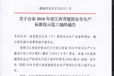 2019年4月3日,瑞昌市安全生產委員會為肯定先進、樹立典型,進一步推動市安全生產工作再上新臺階,決定對2018年全市安全生產目標管理考評先進單位和先進個人予以通報表揚。我單位榮獲2018年度建筑業安全生產唯一的“先進企業”稱號。我單位會繼續扎實開展安全生產專項整治,強化安全生產風險管控,為我經濟社會平穩較快發展創造良好的安全生產環境。