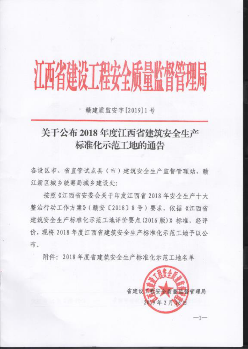 2018年全年安全創(chuàng)優(yōu)工作取得了顯著成績(jī),江西省建筑工程安全質(zhì)量監(jiān)督管理局發(fā)布公告,我司承建的南水.中央公園(一期)項(xiàng)目被評(píng)為“2018年度江西省建筑安全生產(chǎn)標(biāo)準(zhǔn)化示范工地“。