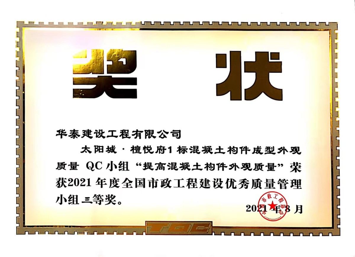 太陽城·檀悅府1標混凝土構件成型外觀質量QC小組“提高混凝土構件外觀質量”榮獲2021年度全國市政工程建設優秀質量管理小組三等獎。