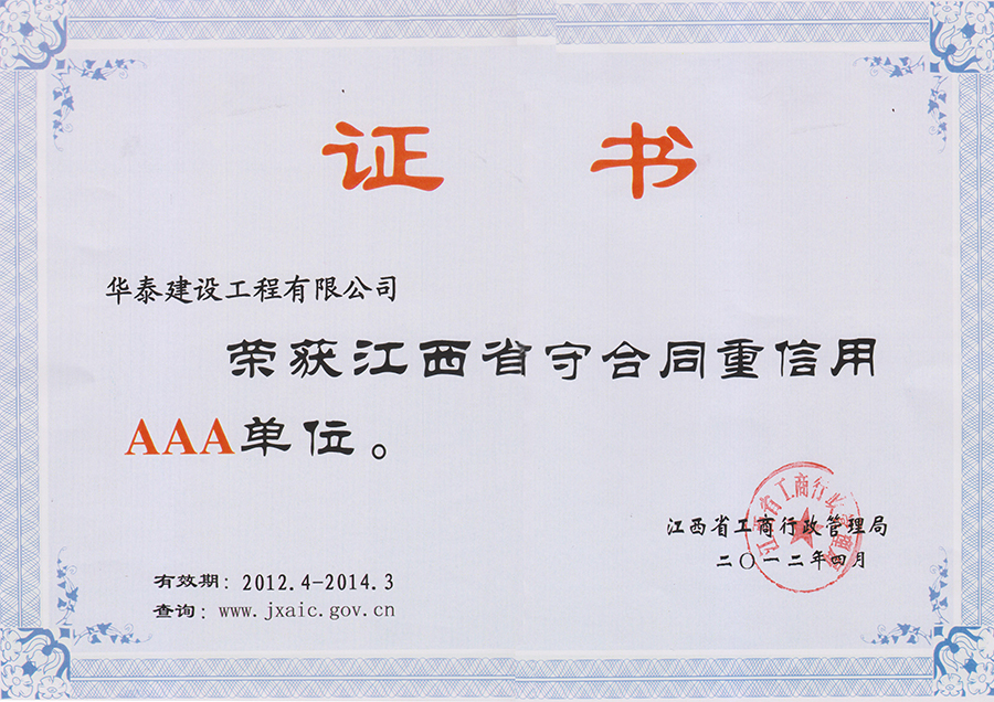 首頁 > 關于華泰 > 企業榮譽 > 榮獲2012年江西省守合同重信用AAA單位