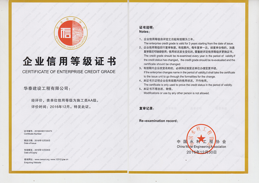 首頁 > 關(guān)于華泰 > 企業(yè)榮譽 > 獲得中國水利工程協(xié)會企業(yè)信用等級證書——2016年施工類AA級